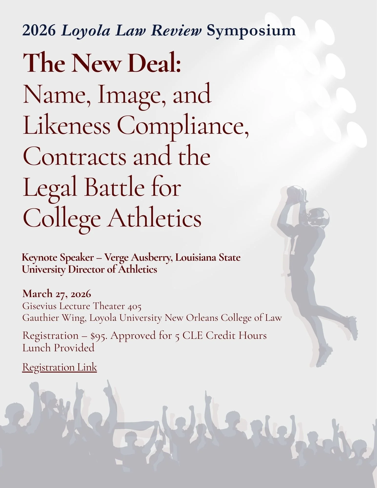 The Loyola Law Review is proud to host its 2026 Symposium entitled, “The New Deal: Name Image and Likeness Compliance, Contracts, and the Legal Battle for College Athletics,” which will explore the rapidly evolving Name, Image, and Likeness (“NIL”) landscape and its profound implications for athletes, coaches, families, and educational institutions. Our Symposium brings together leading attorneys, legal scholars, compliance professionals, and athletic administrators to examine the rapidly evolving landscape of NIL in both high school and collegiate athletics.